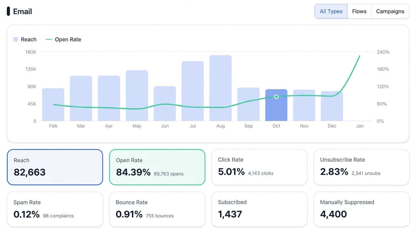 Month-over-month trends help you catch saturation, list health issues, and deliverability risk early.